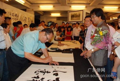胡志明市華人書法協(xié)會(huì)會(huì)長(zhǎng)陳川先生在第5郡文化中心專門安排書法俱樂部成員與廣東禪武書法交流團(tuán)現(xiàn)場(chǎng)揮毫,互贈(zèng)作品,越中書畫家們?cè)谝还P一畫中展現(xiàn)越中友誼萬古長(zhǎng)青。(小琴)