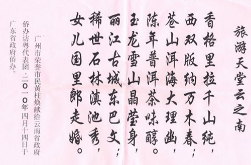 中新網(wǎng)4月16日電 據(jù)云南省僑辦網(wǎng)站消息,4月14日,云南省僑辦副主任張新明一行到廣州舉辦第八屆東盟華商會項目推介,受到廣東省僑辦及廣東省僑商會熱烈歡迎。廣州市榮譽市名、廣東省僑商會常務(wù)理事黃柱煥先生特賦詩一首。