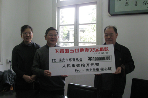 中新網(wǎng)4月20日電 據(jù)瑞安市僑聯(lián)消息,青海玉樹縣的地震震撼了每個中國人,也揪緊了千里之外瑞安僑胞的心。4月19日凌晨5時多,浙江省瑞安市寧益鄉(xiāng)僑聯(lián)主席吳勝運(yùn)接到瑞安籍捷克僑領(lǐng)程志駭?shù)碾娫挘f自己有一筆10萬元的玉樹賑災(zāi)捐款將由他的岳父葉余積轉(zhuǎn)交給瑞安市僑聯(lián)。