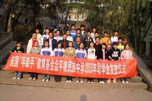 中新網(wǎng)4月26日電 據(jù)貴州省僑聯(lián)消息,2010年4月20日,美國手牽手教育基金會上學(xué)期助學(xué)金發(fā)放儀式在平塘民族中學(xué)舉行。54名貧困學(xué)生再次得到17476元愛心資助。州僑聯(lián)副主席楊宣貴、縣政協(xié)副主席、縣委統(tǒng)戰(zhàn)部部長嚴(yán)福先參加了助學(xué)金發(fā)放儀式,并作了講話。