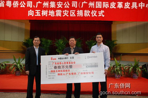 4月24日上午,簡樸熱烈的捐款儀式在廣東省僑辦二樓禮堂舉行。廣東省粵僑企業(yè)總公司黨委書記、總經(jīng)理詹奕群和廣州溫州商會會長、廣州集安投資有限公司董事長朱清國,向廣東省僑辦副主任、省僑心慈善基金會榮譽主席朱爾武遞交了30萬元救災(zāi)捐款支票。廣東省僑辦副巡視員、省僑心慈善基金會監(jiān)事長董華民主持捐贈儀式并講話,他充分肯定了粵僑企業(yè)總公司、集安投資有限公司履行社會責(zé)任,積極參與賑災(zāi)濟困,為國分憂、為民紓難的善舉。據(jù)悉,這筆善款將經(jīng)由廣東省慈善總會盡快匯往玉樹災(zāi)區(qū)。