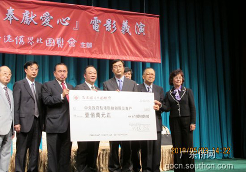 中新網(wǎng)5月6日電 據(jù)廣東僑網(wǎng)消息,5月3日,香港僑界社團(tuán)聯(lián)會(huì)舉行“情系玉樹(shù) 奉獻(xiàn)愛(ài)心 電影義演”暨向玉樹(shù)地震災(zāi)區(qū)捐款儀式,廣東省僑辦主任吳銳成應(yīng)邀出席并講話。