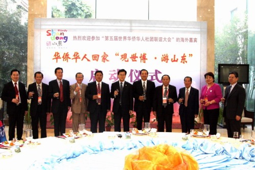省僑辦黨組書記朱緒平在致辭中,對出席“第五屆世界華僑華人社團(tuán)聯(lián)誼大會”的部分代表來山東訪問表示歡迎,對他們成為“觀世博•游山東”的首批尊貴客人表示祝賀,并簡要介紹了山東經(jīng)濟(jì)社會發(fā)展情況,特別是向海外客人推介了山東豐富的旅游資源。