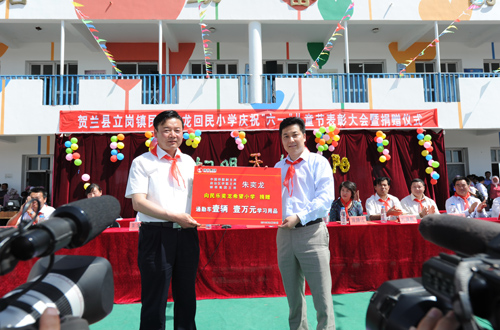 朱奕龍深情地說:和老師同學們一樣,每一個“六一”,既是你們最快樂的節(jié)日,也是我最高興、最幸福的日子。因為10年前,從銀帝集團成立那天起,我就給自己定下了一個目標——每年捐建2所希望小學。如今,10年過去了,我很榮幸并很負責任地向大家報告,已經(jīng)有60多所奕龍希望小學扎根全國、全區(qū)各地,我相信不久的將來,還有更多的希望小學矗立在寧夏山川。2003年,我在黃河岸邊捐建了民樂奕龍小學,吸引了社會上更多關注教育、關注孩子們的眼光,更多的教育資金投向了這里。同時,看到一批批學生從這里走進了更高的學府,我是多么的高興!2008年政治局委員、國務委員劉延東在教育部部長周濟、自治區(qū)黨委書記陳建國、自治區(qū)人民政府主席王正偉等領導視察了民樂奕龍僑心希望小學,對我也是極大的鼓舞。聽說今年4月,民樂奕龍在“寧夏希望工程20年”典型表彰活動中,又連獲“模范希望小學”、“希望工程優(yōu)秀教師”、“希望之星”三項提名獎,我為廣大老師和學校取得的榮譽感到非常的高興,為你們?nèi)〉玫某煽兏械綗o比的驕傲和自豪。今天看著學校優(yōu)良的設施建設,優(yōu)美的教學環(huán)境,我深感欣慰,更為默默無聞、辛勤工作、無私奉獻的教師們感到敬佩。你們長期為了教育事業(yè)工作在鄉(xiāng)村,對艱苦的生活環(huán)境和生活狀況無怨無悔,令我非常感動。