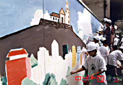 圖片說明: 澳門兒童在街頭工地圍板上繪出城市風(fēng)光,以美化環(huán)境。 |