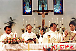 圖片說明: 澳門教區(qū)大主教林家駿(右二)主持圣誕子夜彌撒。 |