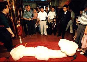 巨型玉雕“中華如意”在福建泉州展出 作者:吳剛強 一柄巨型玉雕“中華如意”,周日在泉州舉辦的第三屆世界福建同鄉(xiāng)懇親大會上首次展示玉身。這柄即將獻給未來澳門特別行政區(qū)的如意,采用天山白云玉精心雕琢而成,全長一千九百九十毫米、寬六百六十毫米,為“中華如意”之最。 |