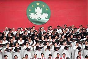 天安門廣場迎澳門回歸100天大型音樂會(huì) 作者:鄒憲 北京十五家文藝團(tuán)體十日下午在天安門廣場舉行“迎澳門回歸倒計(jì)時(shí)一百天大型音樂會(huì)”。來自香港、澳門和內(nèi)地近千名歌唱家在澳門特區(qū)區(qū)徽下高歌《歡樂頌》。 |
