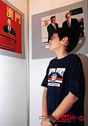 中新社傳真 毛建軍 攝 一名葡萄牙兒童三十一日在澳門(mén)觀(guān)看澳門(mén)回歸歷程圖片展中的何厚鏵演講照片。這個(gè)展覽通過(guò)二百余幅圖片,再現(xiàn)了澳門(mén)回歸的重大歷史事件和進(jìn)程。 |