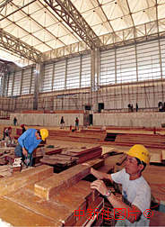 中新社傳真 毛建軍 攝 澳門政權移交大典場館內部工程進行中,施工人員正在裝飾主席臺與觀禮臺。 |