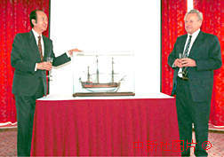 中新社傳真 毛建軍 攝 瑞典駐港領(lǐng)事祈榮富先生(右)九日在澳門將一艘十八世紀(jì)商船模型贈(zèng)送給澳門旅笴娛樂有限公司董事總經(jīng)理何鴻(上焱下木)博士。這艘名為“高登堡”號(hào)的商船隸屬瑞典東印度公司,曾於一七三二年至一八零六年三度來華貿(mào)易,并停泊澳門。 |