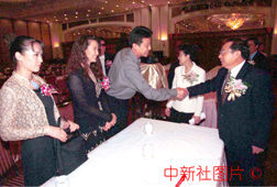 中新社傳真 毛建軍 攝 二十七集電視連續(xù)劇《澳門的故事》首映式九日在澳門舉行,這是中國中央電視臺為迎接澳門回歸而精心制作的重點(diǎn)劇目。新華社澳門分社社長王啟人(右)在首映式上向劇中主要演員(左起)李琳、趙越、佟凡表示祝賀。 |