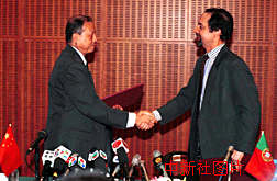 中新社傳真 毛建軍 攝 持續(xù)三天的中葡聯(lián)合聯(lián)絡(luò)小組最后一次全體會議(第三十七次會議)十一日在澳門結(jié)束。雙方對聯(lián)絡(luò)小組十二年來進行的工作進行了總結(jié),對聯(lián)絡(luò)小組所取得的成果表示滿意。圖為中方組長韓肇康(左)與葡方組長賈安棟簽署會談紀要。 |