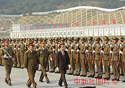 錢其琛檢閱駐澳部隊(duì) 作者:王麗南 解放軍駐澳門部隊(duì)19日公開(kāi)亮相,國(guó)務(wù)院副總理、澳門特別行政區(qū)籌委會(huì)主任委員錢其琛在廣州軍區(qū)司令員陶伯鈞和駐澳部隊(duì)司令員劉粵軍陪同下,在駐澳部隊(duì)珠;貦z閱駐澳門部隊(duì)儀仗隊(duì)。 |