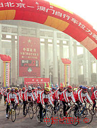 北京至澳門自行車?yán)?/span> 作者:趙振清 慶祝澳門回歸慶典活動(dòng)之一的"中旅杯九九迎回歸北京至澳門自行車?yán)?二十一日開始,十二支專業(yè)隊(duì)的七十多名運(yùn)動(dòng)員上午九點(diǎn)三十分由天安門廣場(chǎng)出發(fā)。這是中國(guó)規(guī)模最大、水平最高、距離最長(zhǎng)的自行車比賽。 |
