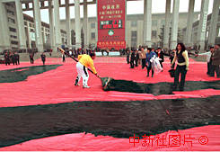 天安門廣場(chǎng)的巨書“龍”字 曾獲吉尼斯世界紀(jì)錄的中國(guó)巨書書法家孫鑫,二十三日在北京天安門廣場(chǎng)澳門倒計(jì)時(shí)牌前,用巨筆書寫一個(gè)九百九十九平方米的巨大“龍”字,該作品將運(yùn)往澳門展出。作者:宗金柱 |