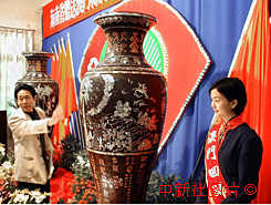 椰雕嵌貝花瓶迎接澳門回歸 中新社記者 張煒 攝 海南省祝賀澳門回歸的禮品—— “椰樹傳說”和“天涯歡歌”巨型椰雕嵌貝花瓶二月一日下午在?谑姓搅料,不日將運往珠海然后送抵澳門。兩座花瓶各重八十公斤,高一千九百九十九毫米。這對花瓶由海南省藝術(shù)家設(shè)計,?谑幸駨S的三十名工匠共同制作完成的。 |