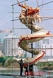 迎澳門回歸澳門南灣湖安裝“群龍戲水”大型燈飾 中新社傳真 毛建軍 攝 為迎接澳門回歸,澳門南灣湖內正在加緊安裝“群龍戲水”等四組大型燈飾。 |