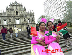 澳門少女裝扮成蓮花仙子形象 澳門少女裝扮成中國古代美麗祥和的蓮花仙子形象,在大三巴前參加一個慶祝澳門回歸的活動。中新社傳真 |