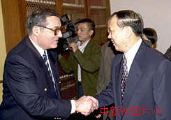 廣東省公安廳廳長(zhǎng)來(lái)澳出席第三十三次粵澳治安會(huì)議 前來(lái)澳門(mén)出席第三十三次粵澳治安會(huì)議的廣東省公安廳廳長(zhǎng)陳紹基(右),六日會(huì)晤澳門(mén)保安政務(wù)司孟明智。中新社傳真 毛建軍 攝 |