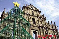 圣誕前的大三巴 澳門大三巴古老的牌坊前新搭建圣誕燈飾,為即將回歸增添節(jié)日氣氛。 中新社傳真