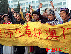 民族大學生迎澳門回歸 作者:趙振清 北京中央民族大學的師生們十日上午在校園內(nèi)用各民族文字書寫喜迎澳門回歸橫幅,迎接這一大喜日子的到來。 |