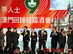 香港各界十八個團體十五日在會議展覽中心舉行盛大酒會,特首董建華、外交部駐港特派員公署特派員馬毓真、新華社香港分社社長姜恩柱等嘉賓舉杯相互祝賀回歸澳門祖國。 中新社傳真洪少葵攝 |