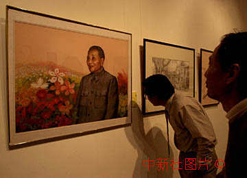 中新社數(shù)碼傳真 賈國榮攝 澳門回歸前在市政廳內(nèi)展出中國畫家名作,其中描繪鄧小平的作品表現(xiàn)出澳門回歸的宏偉設(shè)想,吸引觀眾欣賞緬懷。 |