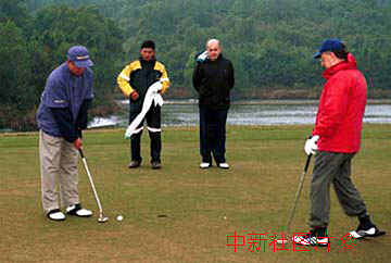 葡萄牙總統(tǒng)沈拜奧(右一)、澳門總督韋奇立(右二)與澳門特別行政區(qū)首任行政長官何厚鏵冒雨在澳門高爾夫球俱樂部切磋球藝。中新社傳真 毛建軍攝 |