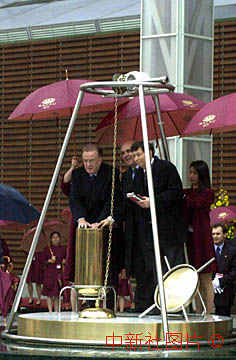 葡萄牙總統(tǒng)沈拜奧(左一)、澳門總督韋奇立(左二)十八日將一只裝有澳門回歸有關(guān)文件的時(shí)間囊封閉。這個(gè)時(shí)間囊將在澳門回歸移交大典場(chǎng)館前的地下封存五十年。中新社數(shù)碼傳真 毛建軍攝 |