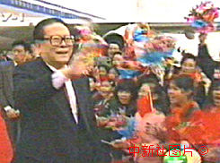 國家主席江澤民十九日正午十二時十八分踏上了澳門的土地。江澤民站在紅地毯上向澳門招手。中新社傳真 |