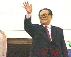 中國國家主席江澤民今天中午十二時許乘專機抵達澳門,步出機艙的一瞬向歡迎的人群招手致意。中新社傳真 |