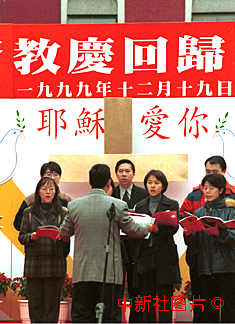 澳門宗教界人士十九日在大三巴遺址廣場齊唱頌歌,歡慶回歸。中新社傳真 賈國榮攝 |