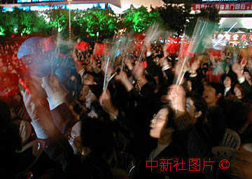19日晚,珠海市舉辦多臺文藝晚會迎接澳門回歸,圖為九洲城市民在歡呼20日零時的到來。作者:蕭琨 |