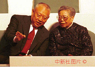 鄧小平遺孀卓琳和香港特首董建華在澳門政權(quán)交接儀式上。中新社傳真 李剛攝 |