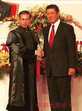 澳門特區(qū)檢察院檢察長(zhǎng)向澳門特別行政區(qū)首任行政長(zhǎng)官何厚鏵宣誓就職。中新社傳真 洪少葵攝 |