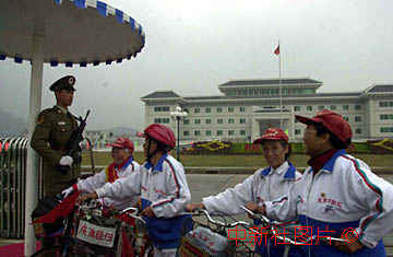 由天津老年人組成的夕陽(yáng)紅自行車隊(duì)赴澳門宣傳團(tuán),18日到達(dá)解放軍駐澳部隊(duì)軍營(yíng)為戰(zhàn)士送行。中新社數(shù)碼傳真 王瑤攝 |