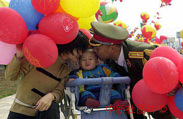 駐澳部隊通訊兵黃立新和前來送行的妻子,一歲的兒子告別。中新社數(shù)碼傳真 王瑤攝 |