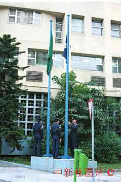澳門(mén)治安警察局舉行升旗儀式。擁有四千多名警察的治安警察局是當(dāng)日零點(diǎn)將原治安警察廳中的“廳”換掉而改為本名的。 中新社傳真 曾憲成攝 |