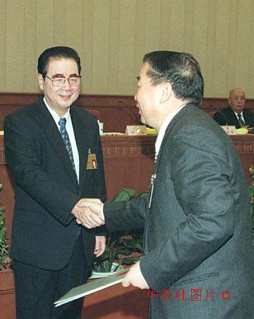 李鵬委員長二十日下午向全國人民代表大會常務(wù)委員會澳門特別行政區(qū)基本法委員會組成人員喬曉陽等十人頒發(fā)任命書。圖為喬曉陽主任接受任命書。作者:任海霞 |