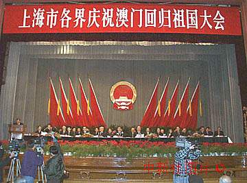 申城各界人士二十日在上海友誼會(huì)堂隆重舉行慶祝澳門回歸祖國(guó)大會(huì),上海市黨政領(lǐng)導(dǎo)和有關(guān)方面人士千余人出席了大會(huì)。作者:吳達(dá) |