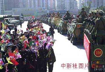 解放軍駐澳門部隊二十日十二點整前進到珠海與澳門相連的關(guān)閘,開始進駐澳門,受到珠海軍民的熱烈歡送。中新社數(shù)碼傳真 王瑤攝 |