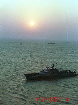 澳門回歸中國第一個(gè)日出海上紅日高照,映照在海邊擔(dān)負(fù)保衛(wèi)的艦艇。 中新社傳真 賈國榮攝 |