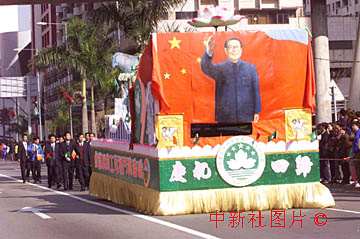 澳門回歸之日在鬧市舉行盛大的“邁向美好明天"大巡游中,國家主席江澤民揮手形象的花車最引人注目。中新社數(shù)碼傳真 宗金柱攝 |