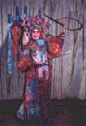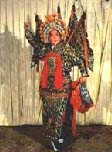 鎧甲類 古代作戰(zhàn)時,戰(zhàn)士穿的鎧甲,在京劇舞臺上叫靠,是一種美化了的舞蹈服裝?渴怯煤蜕乃鼐勛又瞥傻模厦嬗媒、銀彩線繡滿鱗甲,看上去輝煌奪目。 靠分男靠、女靠。 男靠式樣是分前后兩扇披在肩上,還有護(hù)領(lǐng)、護(hù)肩、下甲、吊魚、靠肚子以及收緊的瘦袖。 女靠上身與男靠形式差不多,下身綴著五色繡花的飄帶,并在靠里襯著裙子,但在開打時,里面也不裙子。 靠一般分硬靠、軟靠和改良靠三種, 穿用人物有《霸王別姬》中的項羽(穿平金黑靠)、《古城會》中的關(guān)羽(穿平金綠靠)、《挑滑車》中的岳飛(穿白靠)、高寵(穿藍(lán)靠)、《連環(huán)計》中的呂布(穿粉靠)、《破洪州》中的楊宗保(穿淡湖靠)等。 戲曲舞臺上扮演女將、女統(tǒng)帥的戰(zhàn)服多采用女大靠。戲劇中使用的大靠與古代生活中的甲胄并不一樣。隨著戲曲藝術(shù)的發(fā)展,大靠的式樣和色彩逐漸增多,但距生活服裝也越來越遠(yuǎn)。它純屬為了適應(yīng)舞臺表演的需要而設(shè)計。 建國前女大靠種類較少,只有梅蘭芳演出《穆柯寨》"花廳招親"一場戲穿用"玻璃肚子"(用玻璃棍裝飾的改良靠)。建國后女靠樣式逐漸增多,色彩不斷豐富。戲曲服裝中,女靠比男靠樣式多,而男靠比女靠色彩豐富,女靠只有粉紅、大紅、淡湖等色。新編歷史劇《楊門女將》出臺之后,出現(xiàn)了女白靠、黑靠、雪青靠、米黃靠等。 穿用人物有新編歷史劇《三請樊梨花》中的樊梨花、 軟靠:背后不插靠旗。一般是老年體弱的老將穿用。 改良靠:樣式與軟靠近似,只要腰身既緊又瘦,幾乎就象用腰帶系在身上。有的繡鱗甲,有的繡些花紋或鑲上一些鍍鎳的金屬凸片或看著晶光閃亮象圓釘子形的裝飾。 戲曲舞臺上扮演番將、武將群眾或新編歷史劇中常用改良靠。穿用人物有《雛鳳排空》中的番將韓昌、《三打陶三春》的鄭子明、《鬧龍宮》中的龍子等。 鎧是戲曲舞臺上扮演皇家殿前御林軍、隨駕儀仗隊或軍中統(tǒng)帥的服裝,又稱大鎧。色彩以紅為主,多繡平金幾何圖形紋樣。它的造型與生活中的甲胄相似?梢娝且怨糯罘b為依據(jù)的,只是做法不一。生活服裝有銅釘(有的鍍金)固定在衣服上,而舞臺上的大鎧以平金繡為主。這種穿大鎧的武士在舞臺上只是擺排場,壯聲勢,沒有武打動作。